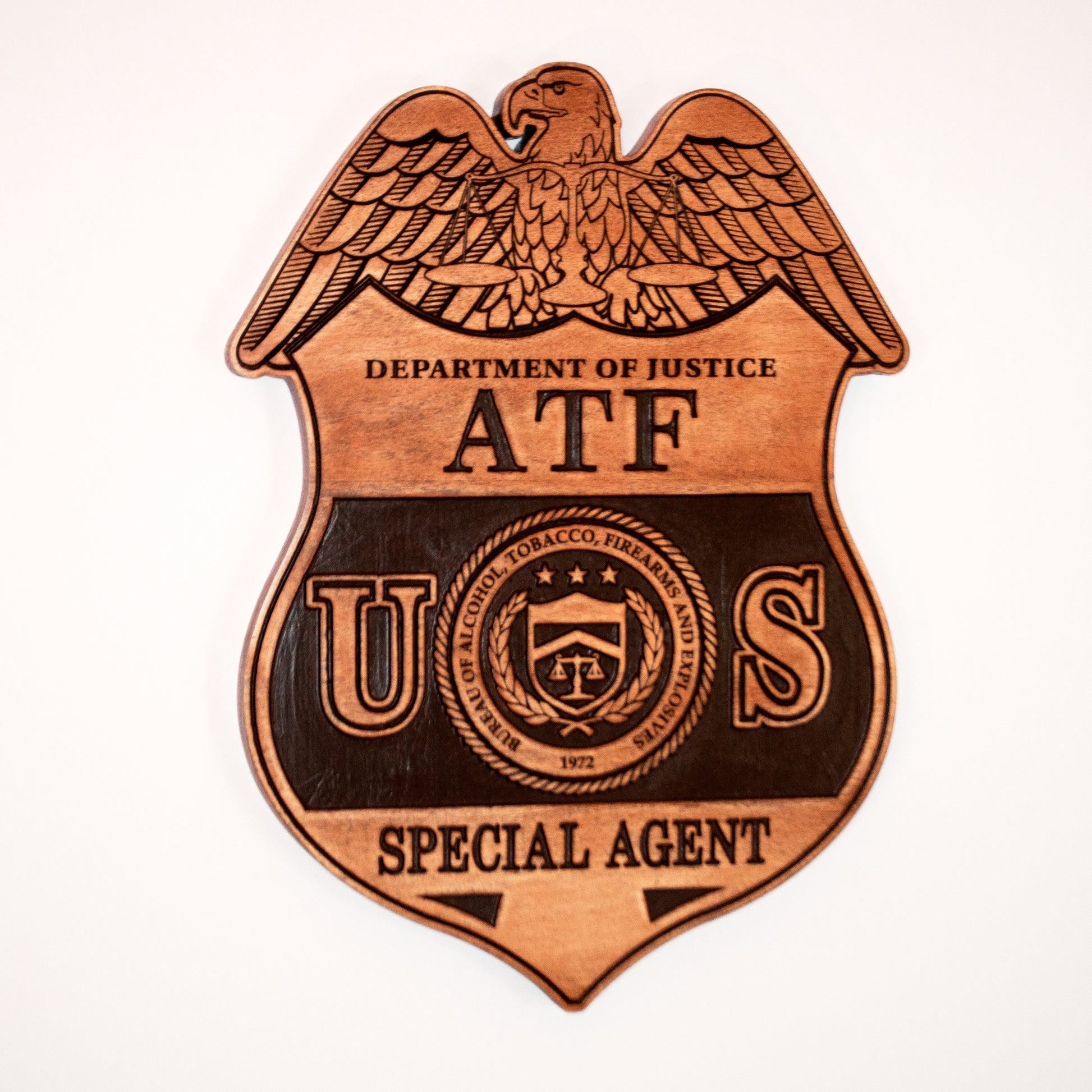 Decorate your home or office with this beautiful all wood ATF badge. This carved sign is made from solid maple wood. It measures approximately 17" x 12". Service in the ATF will have to be verified before work can commence on this sign. You can get it with or without a badge number. We also have the option for all the EEOs out there. The badge number in the photo has been masked to keep the Special Agent's privacy.